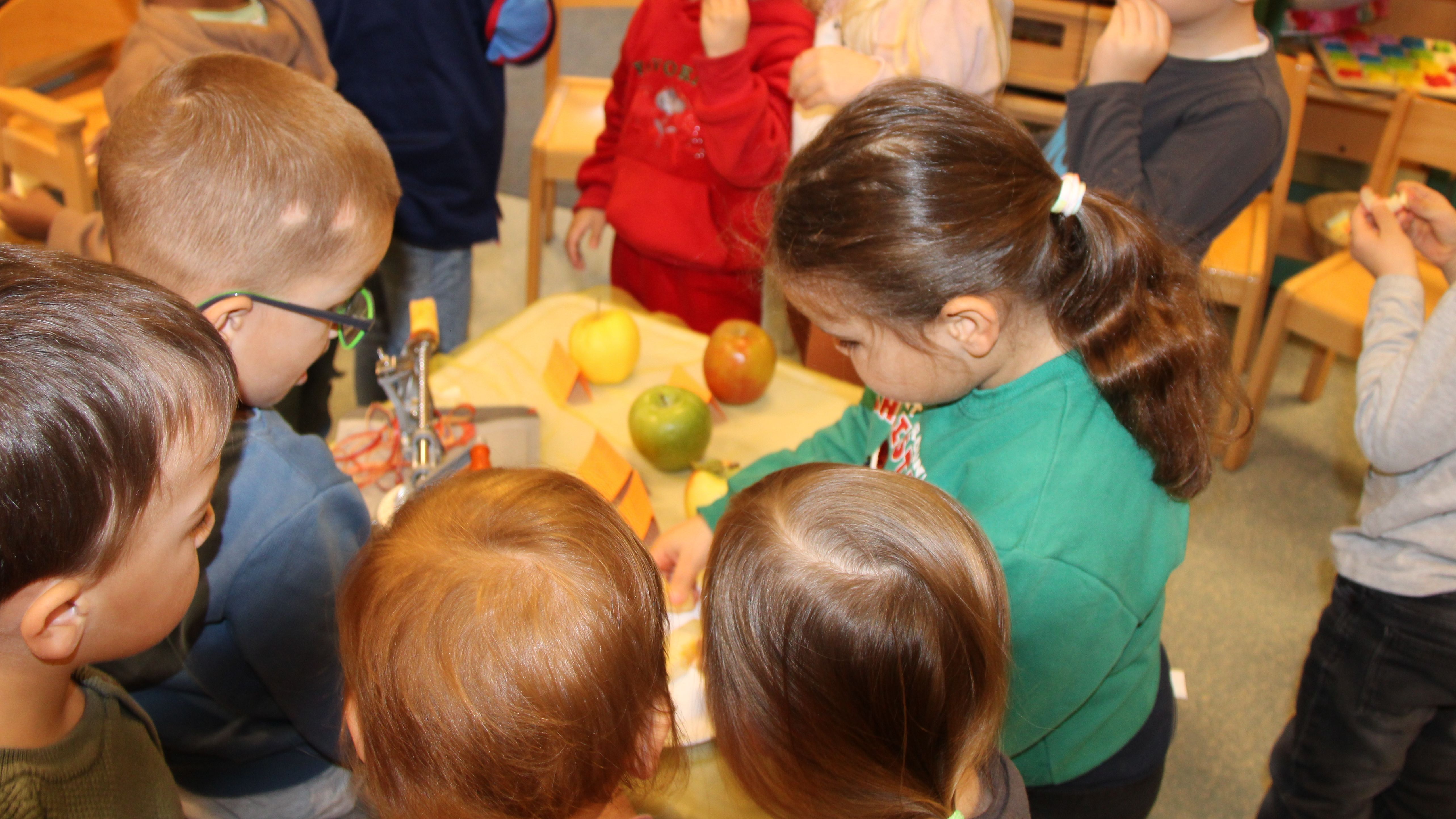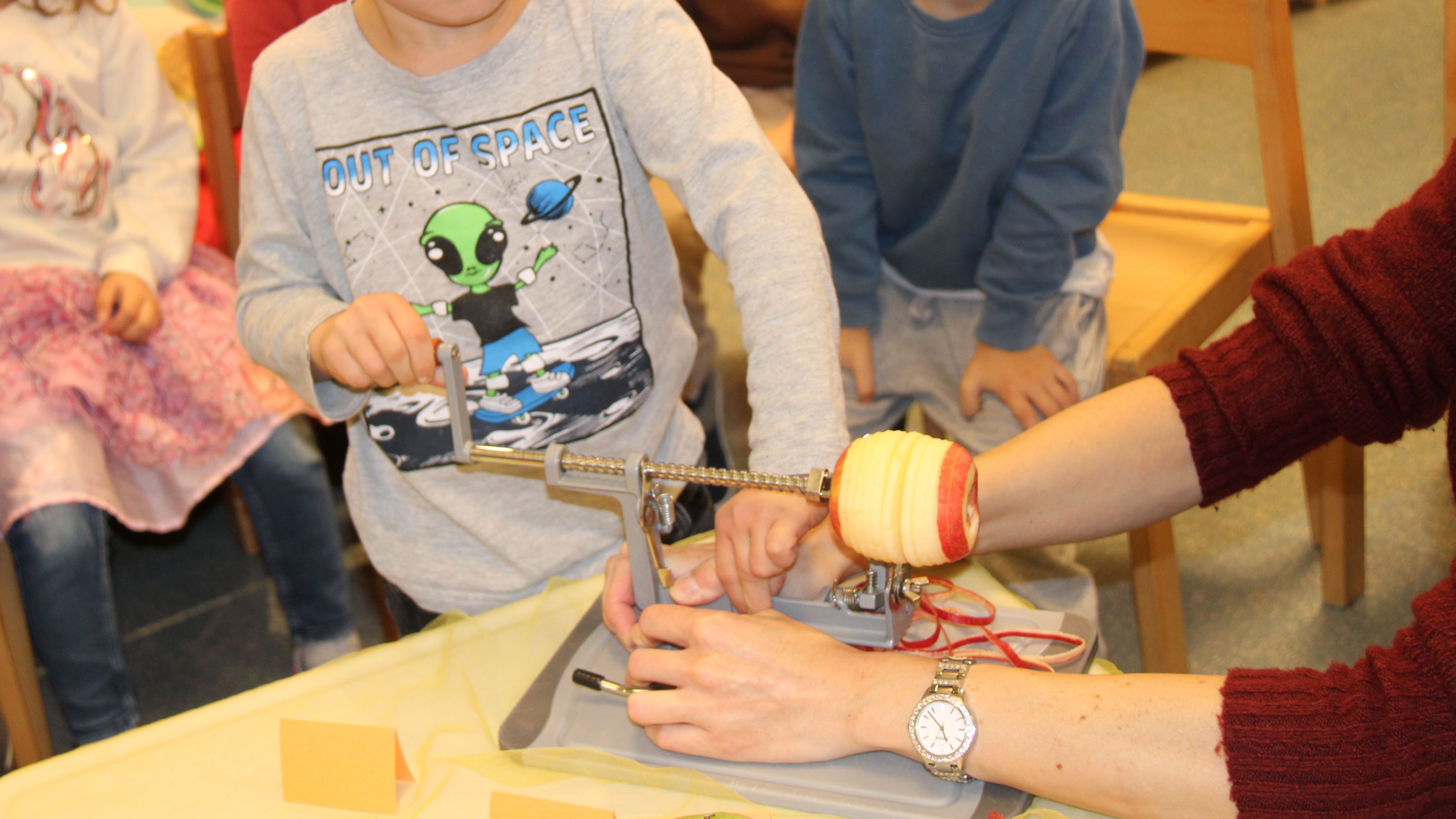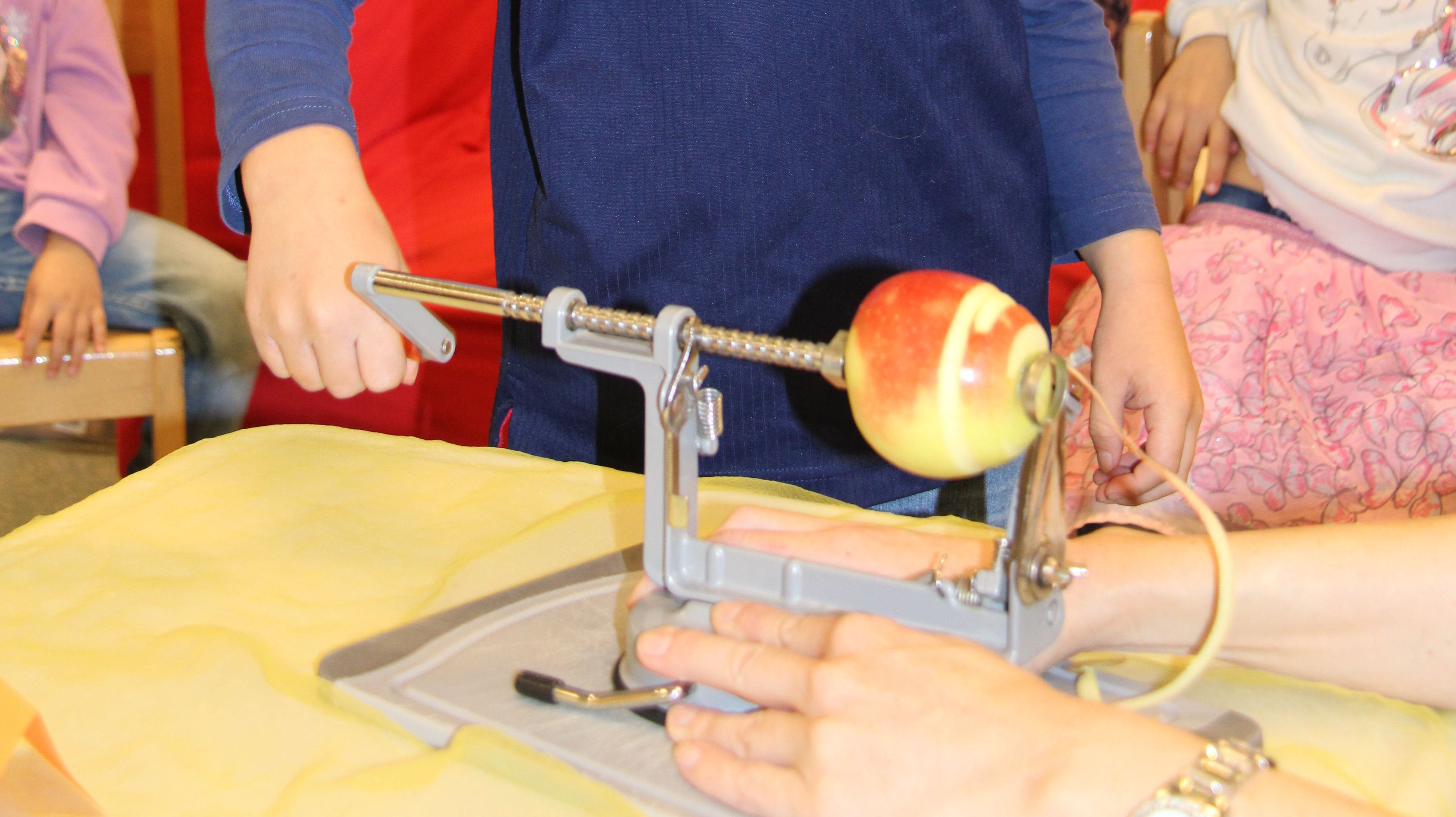 Im Stuhlkreis lernten die Kinder verschiedene Apfelsorten kennen und durften sie mit allen Sinnen ausprobieren – riechen, fühlen, schmecken und vergleichen. Besonders spannend war es, als jedes Kind seinen eigenen Apfel mitbrachte, den wir mit unserer Apfelschälmaschine gemeinsam geschält, geschnitten und natürlich genüsslich vernascht haben.