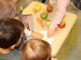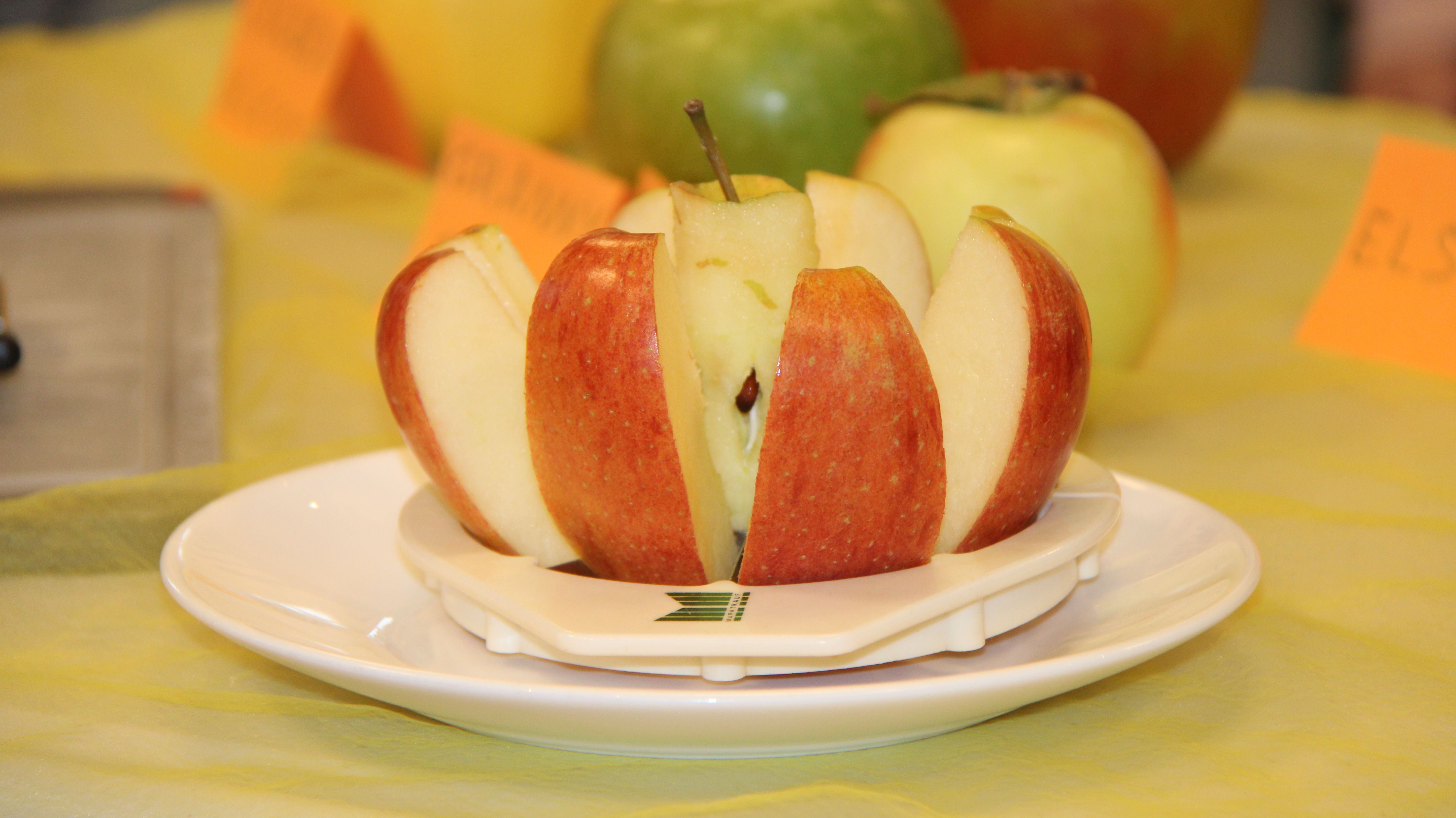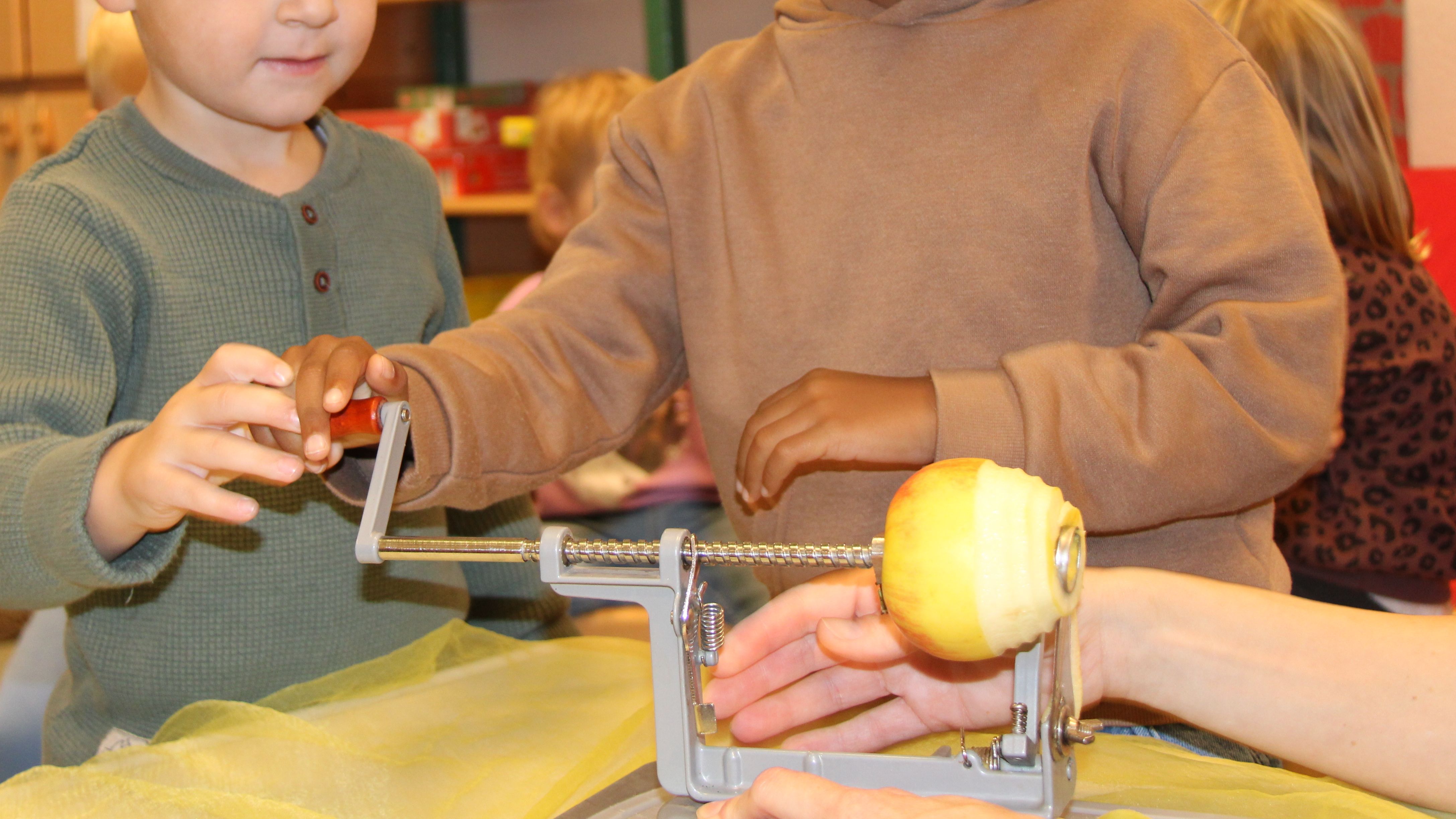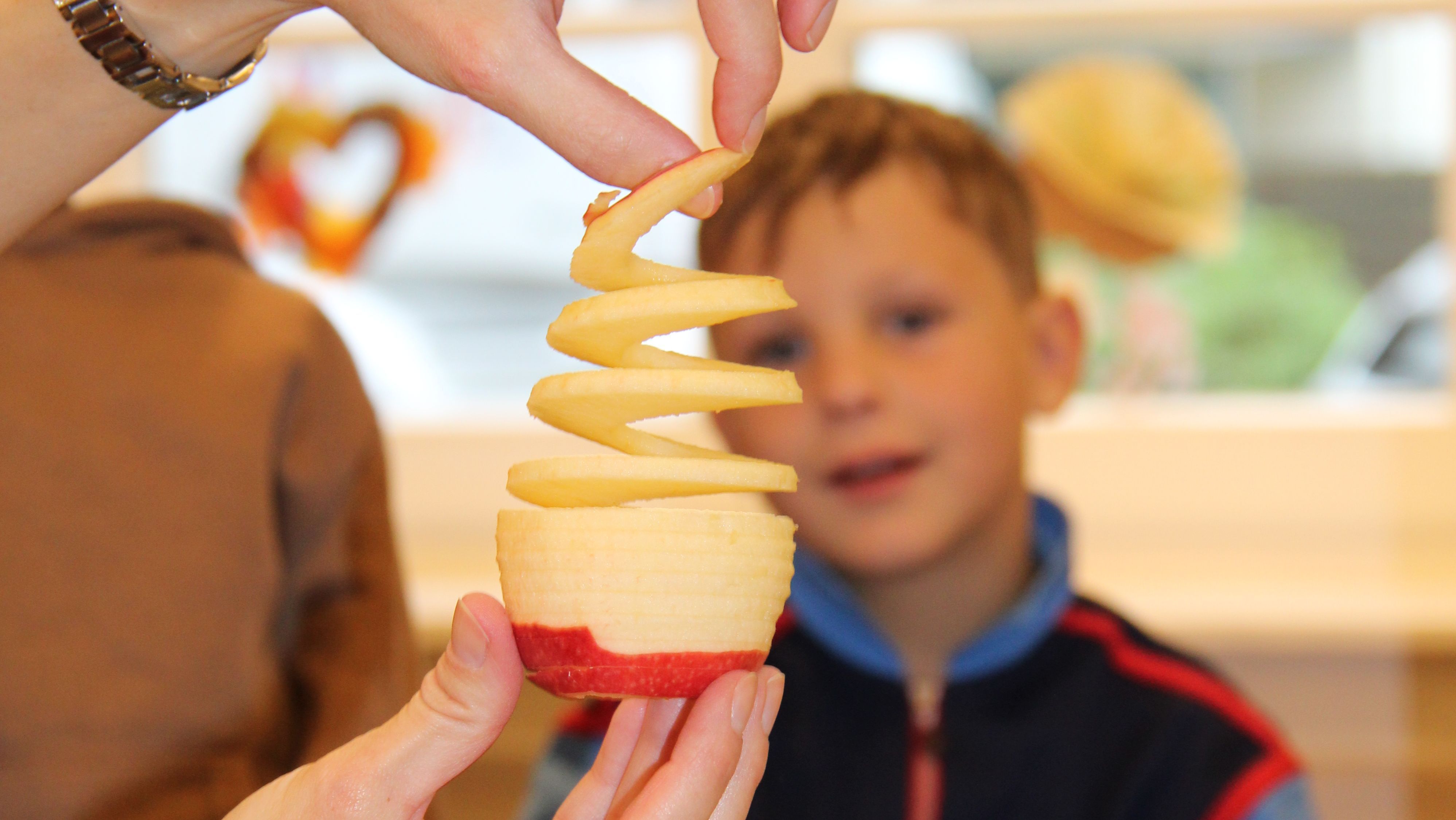 Im Stuhlkreis lernten die Kinder verschiedene Apfelsorten kennen und durften sie mit allen Sinnen ausprobieren – riechen, fühlen, schmecken und vergleichen. Besonders spannend war es, als jedes Kind seinen eigenen Apfel mitbrachte, den wir mit unserer Apfelschälmaschine gemeinsam geschält, geschnitten und natürlich genüsslich vernascht haben.