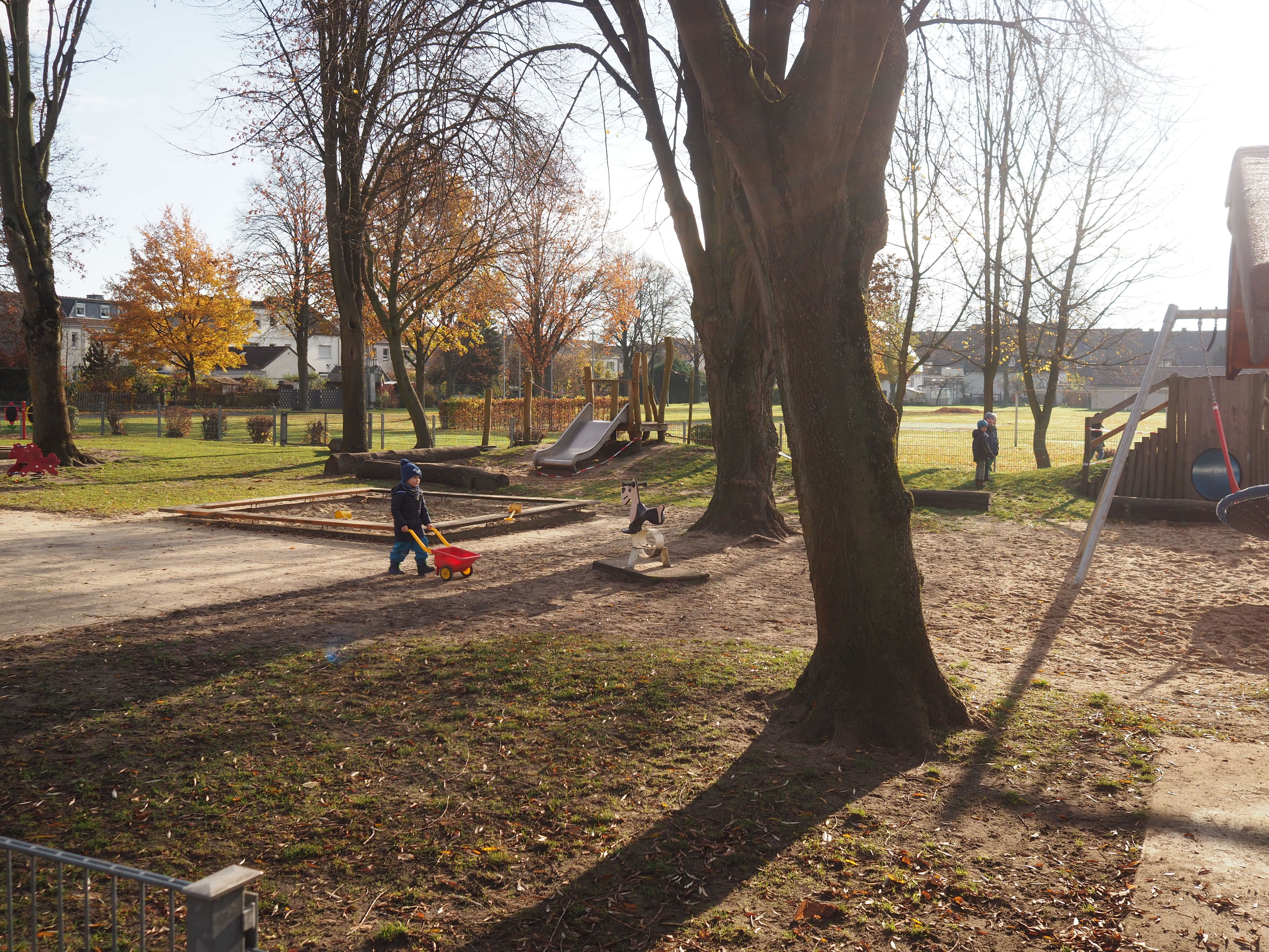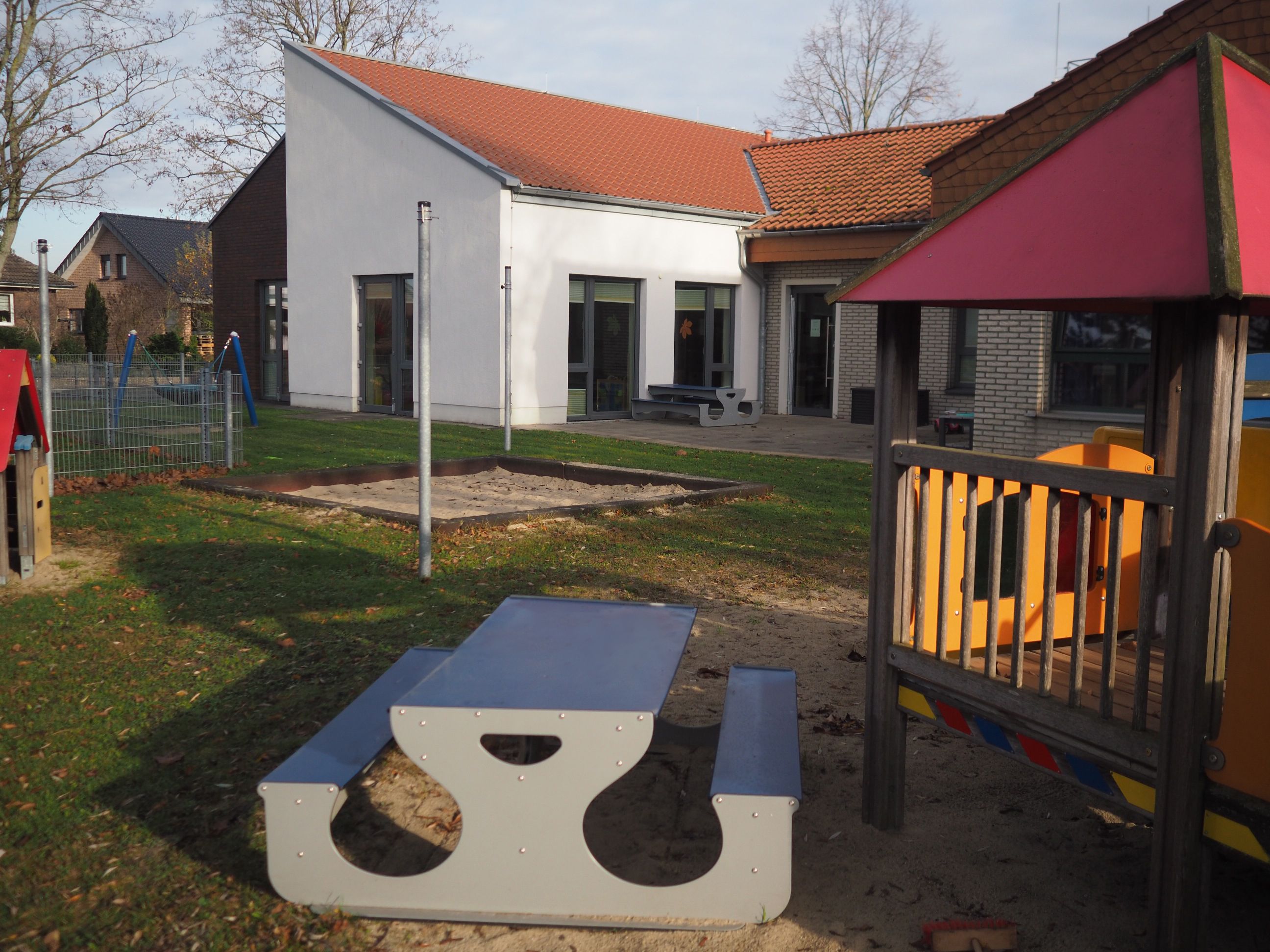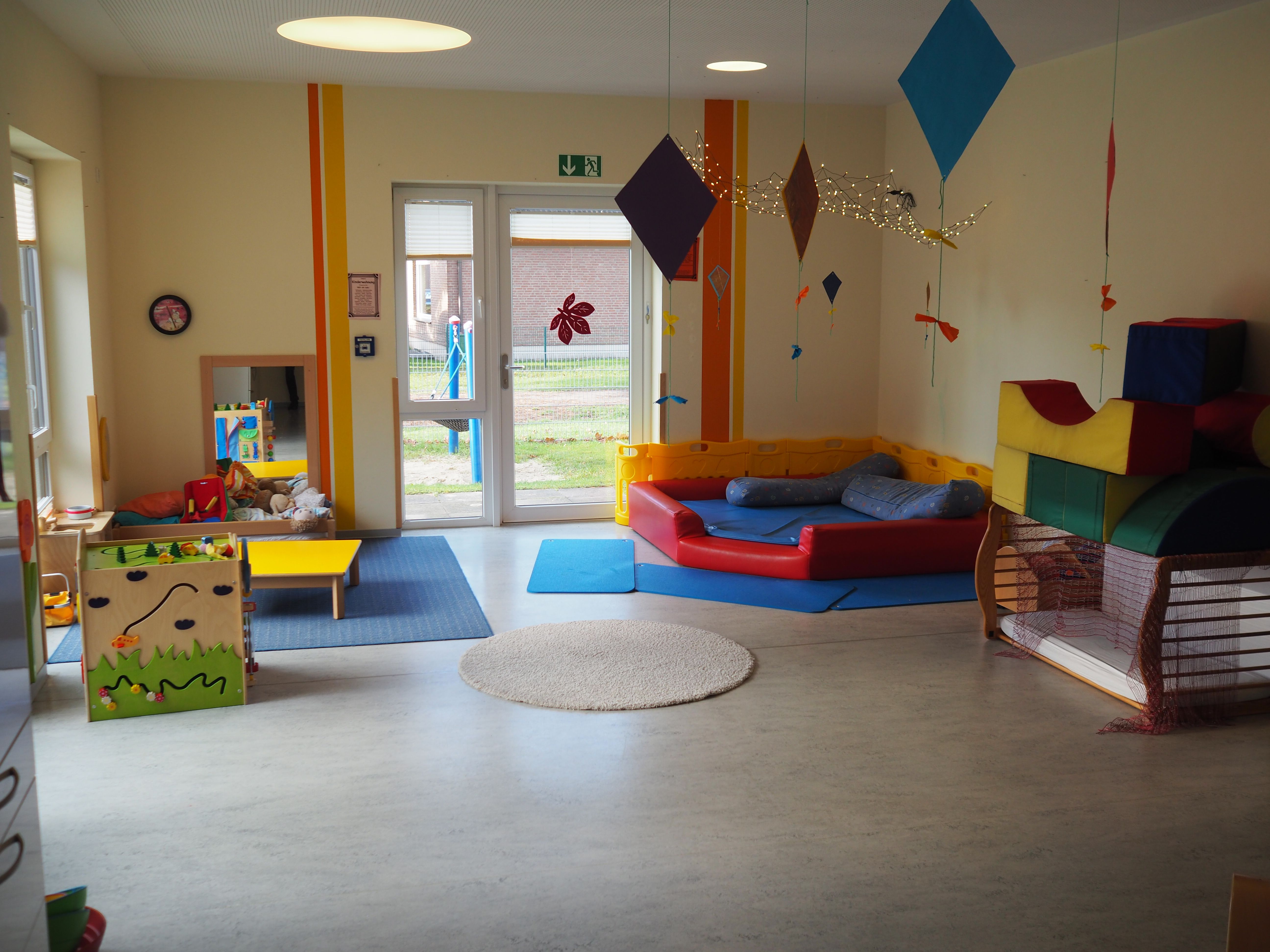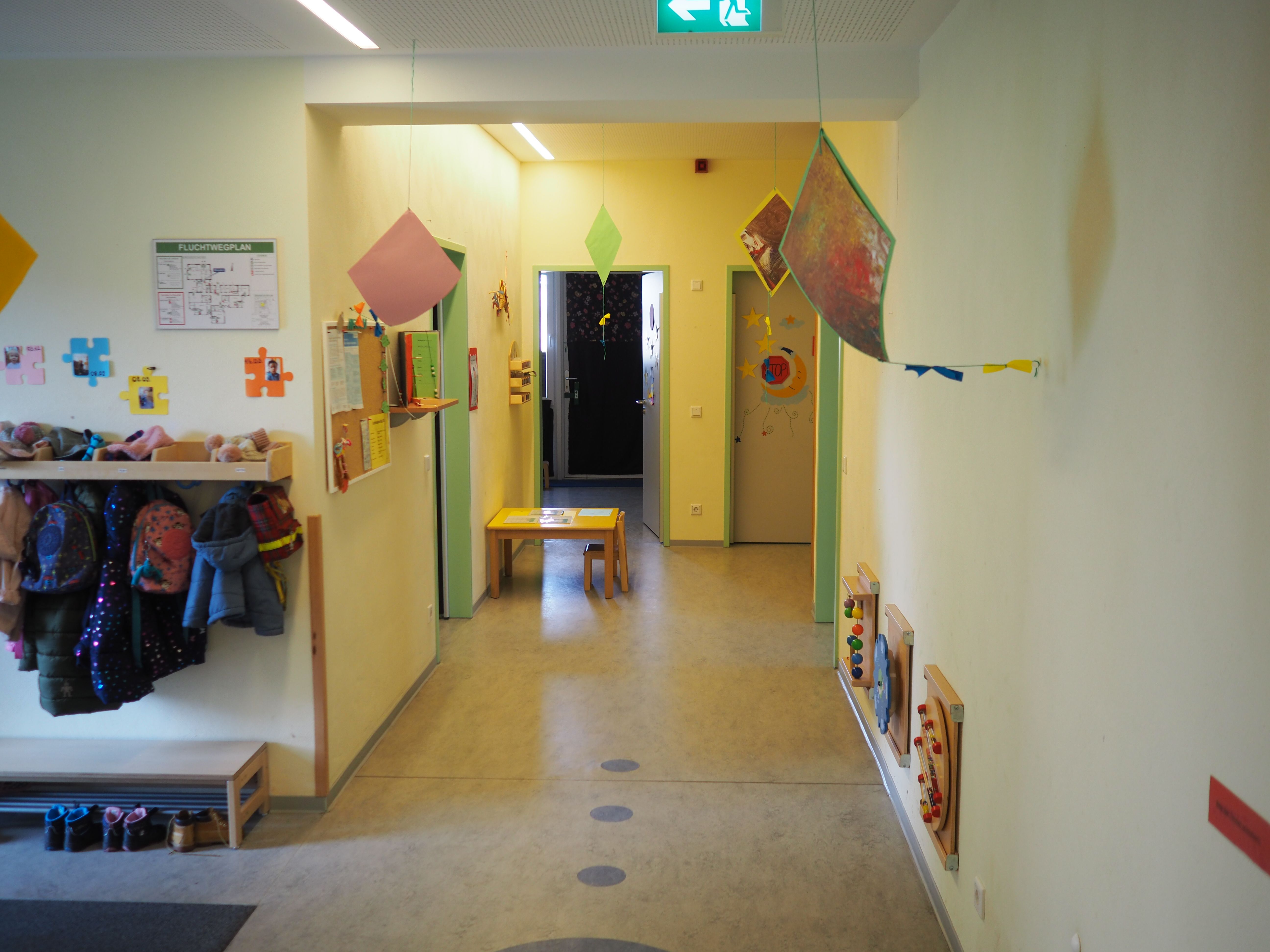 Ein Ausweichraum sowie die Bibliothek stehen für Kleingruppenarbeit zur Verfügung. Unser großes Außengelände mit Spielplatz bietet viele Spielangebote sowie ausreichend Fahrzeuge.